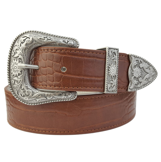 Belt: Trendy Floral Tooled Belt with a silver floral etched buckle