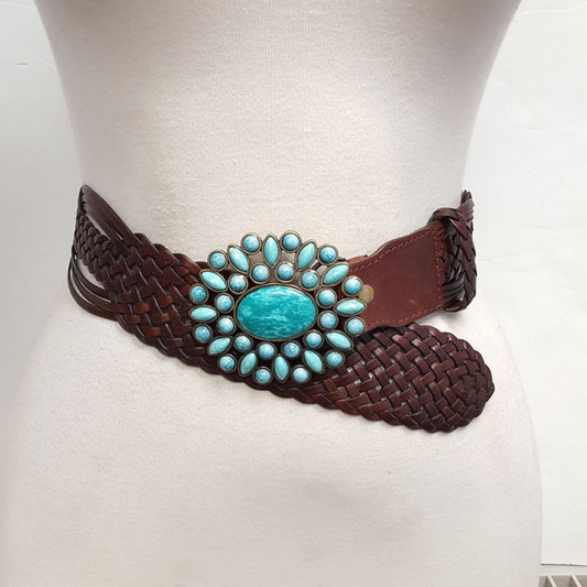 Belt: Hand Braided Leather Belt with Turquoise Style Buckle
