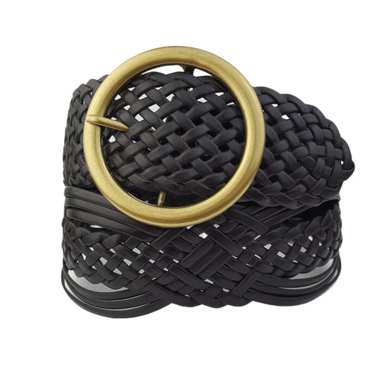 Belt: Hand Braided Leather Belt with Round Brass Finish Buckle