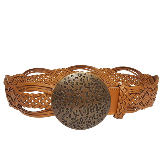 Belt: Hand Braided Leather Belt with Copper Round Buckle