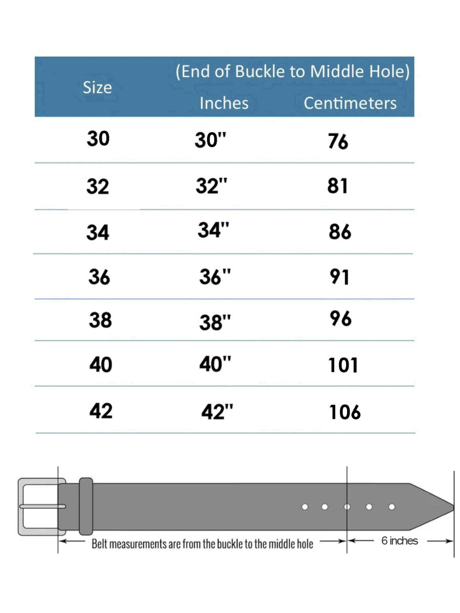Size 38: Length from Start of strap to middle hole 38", then add 6.5" more to tip end For example, size 32, the total strap length is 38.5"