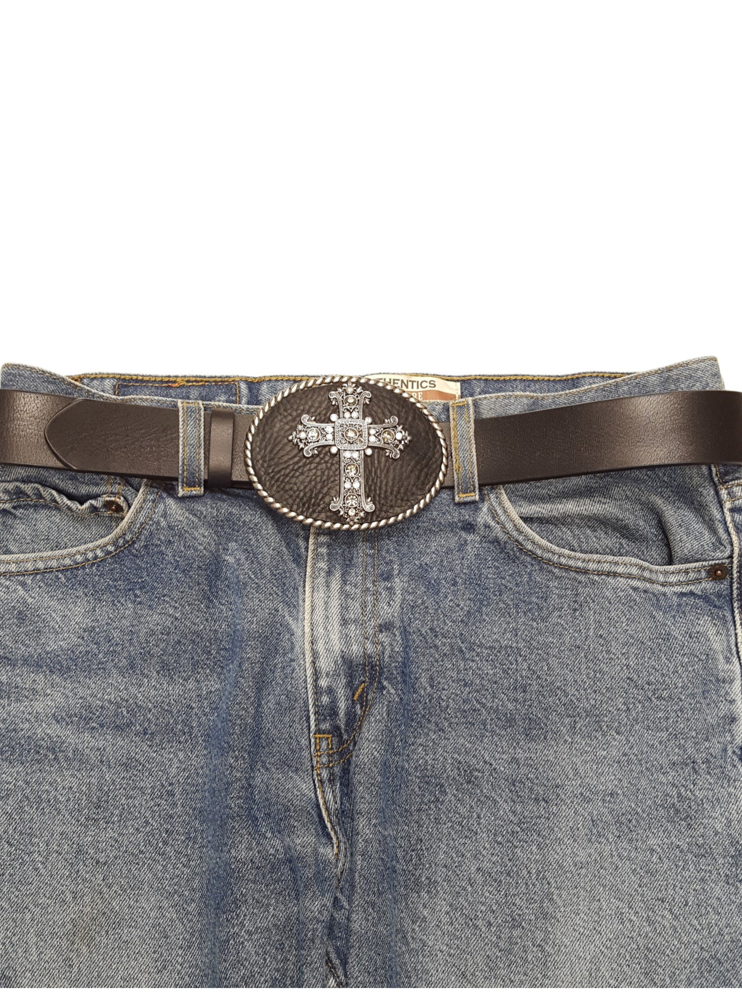 Genuine soft pebble leather inlay on the buckle and add on a crystal cross