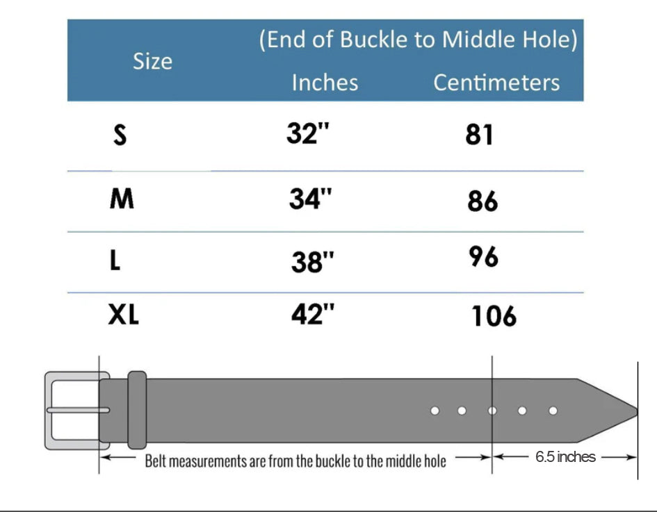 Strap measurement to middle hole(S/30", M/34", L/38", XL/42")