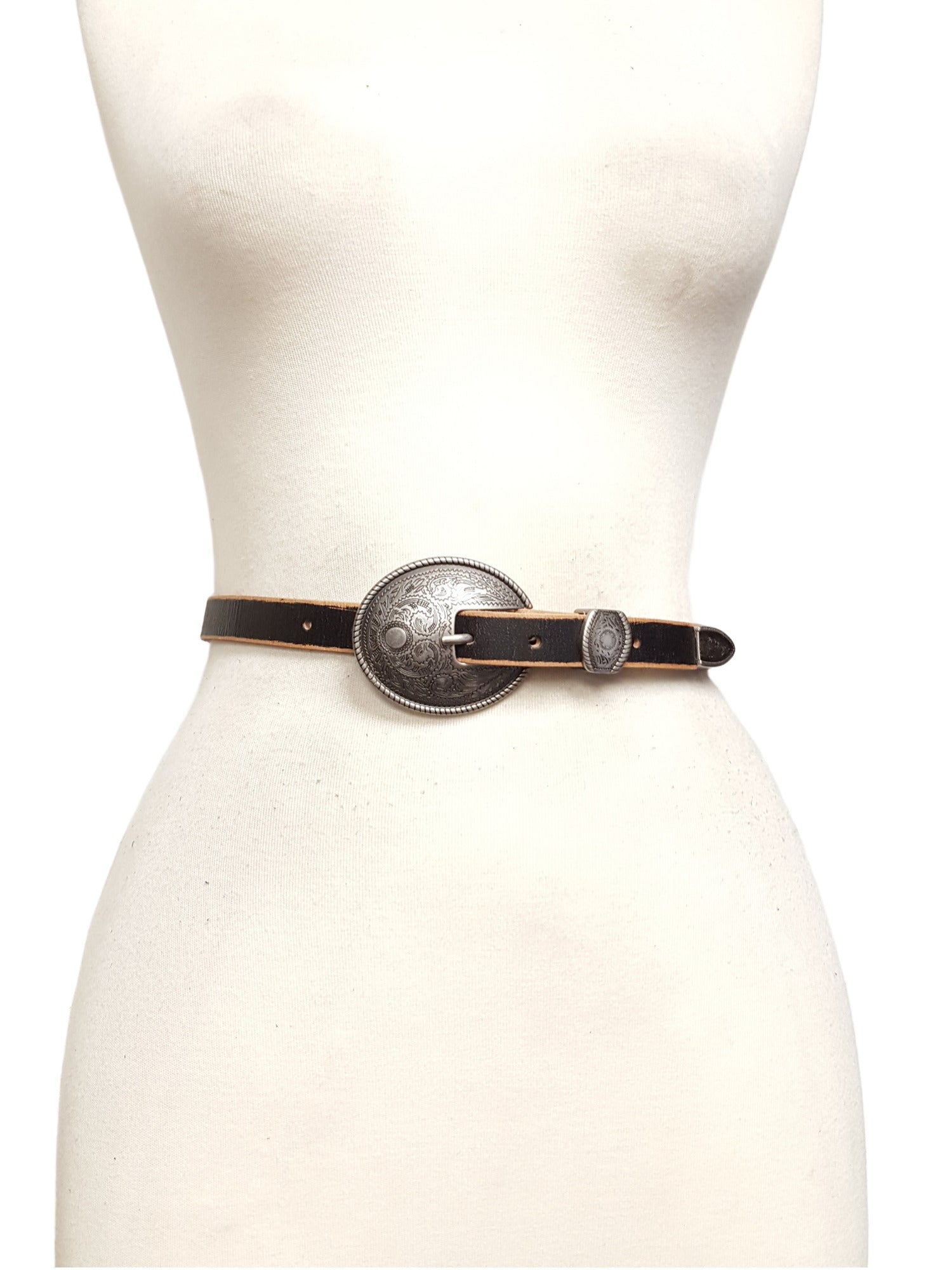 Belt: Vintage Skinny Leather Belt w. antique silver floral buckle