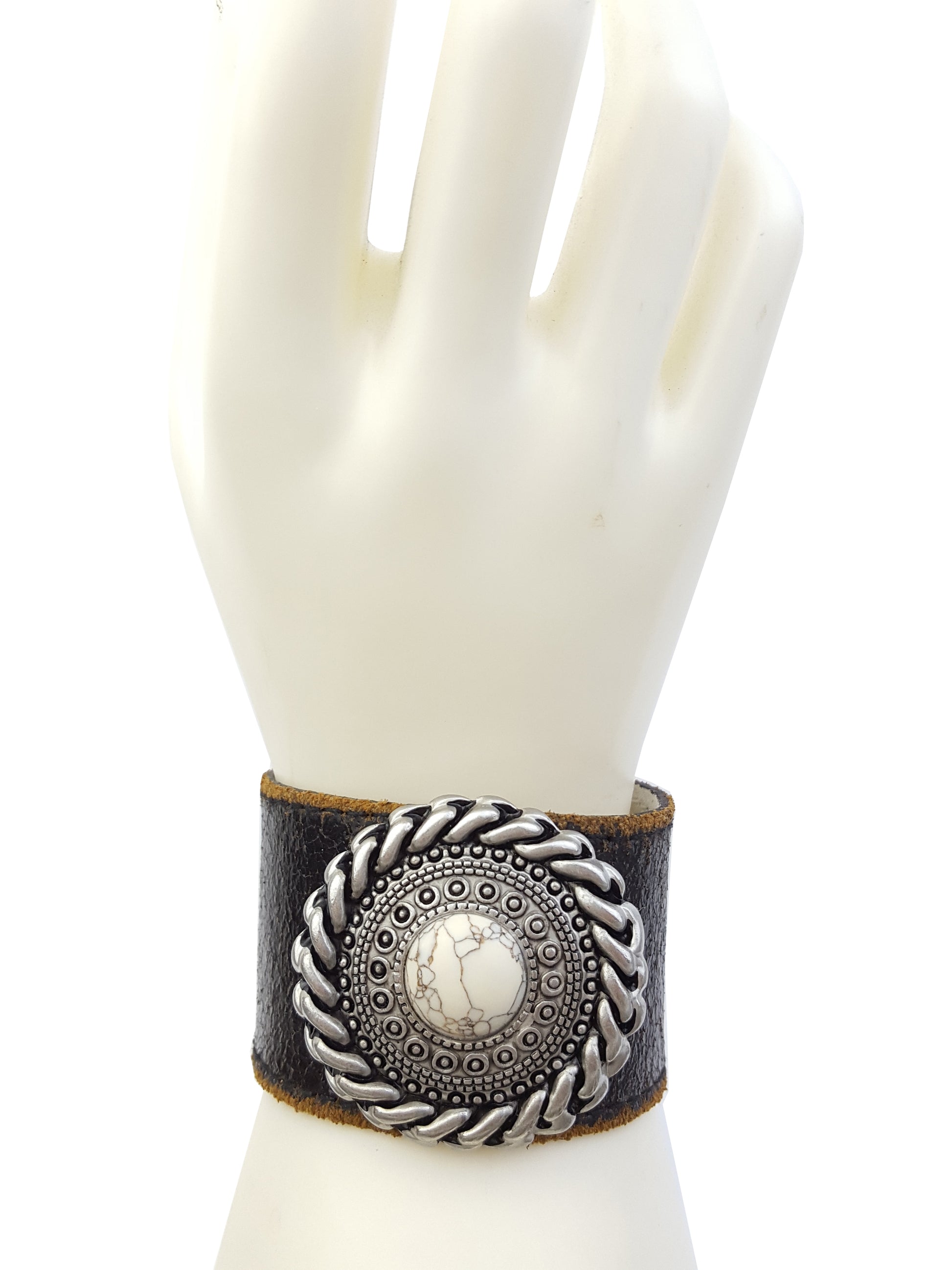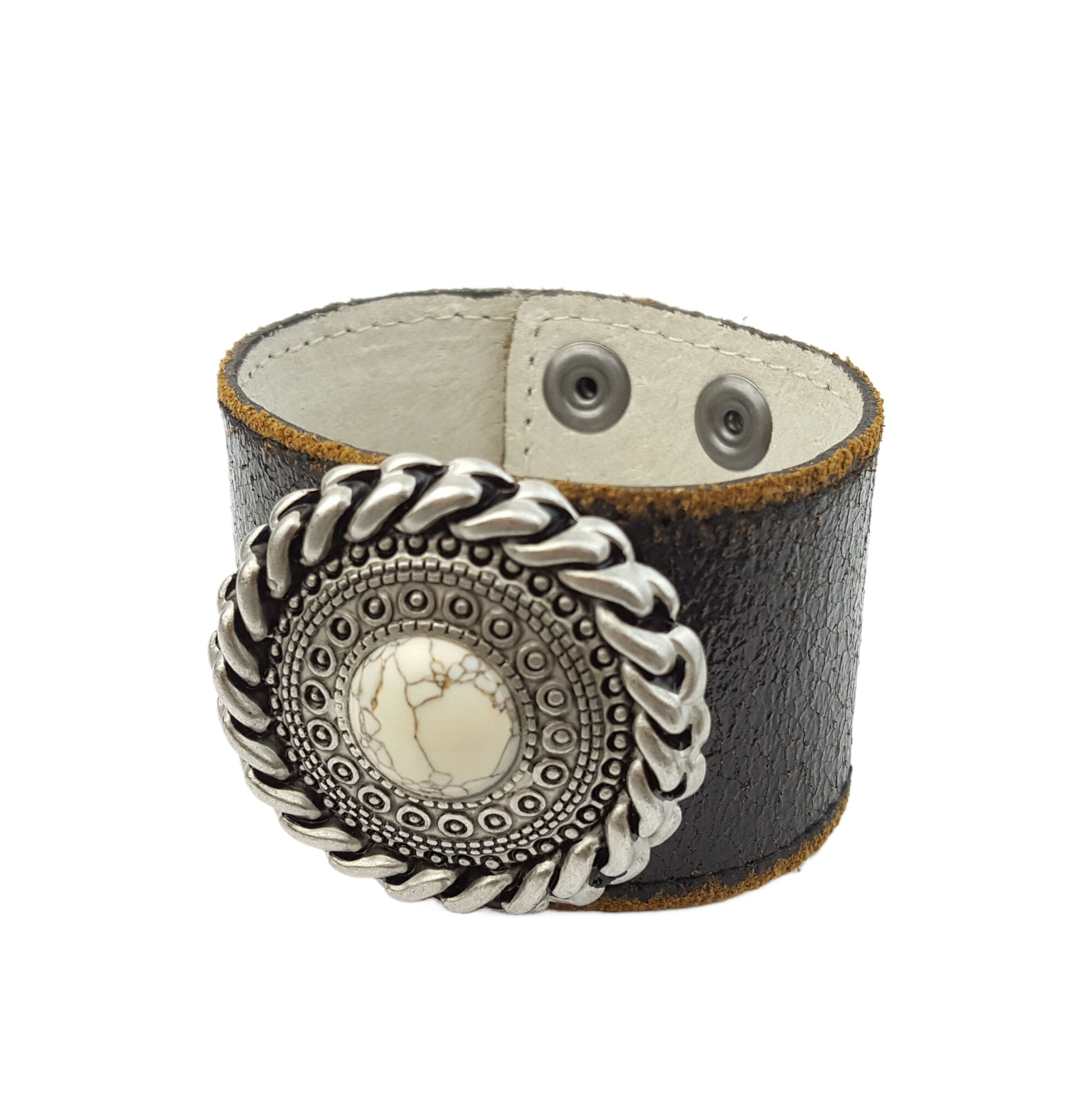 100% Genuine Vintage/Cracked/Distressed leather. Concho in a matte silver finish with real stone in the middle.