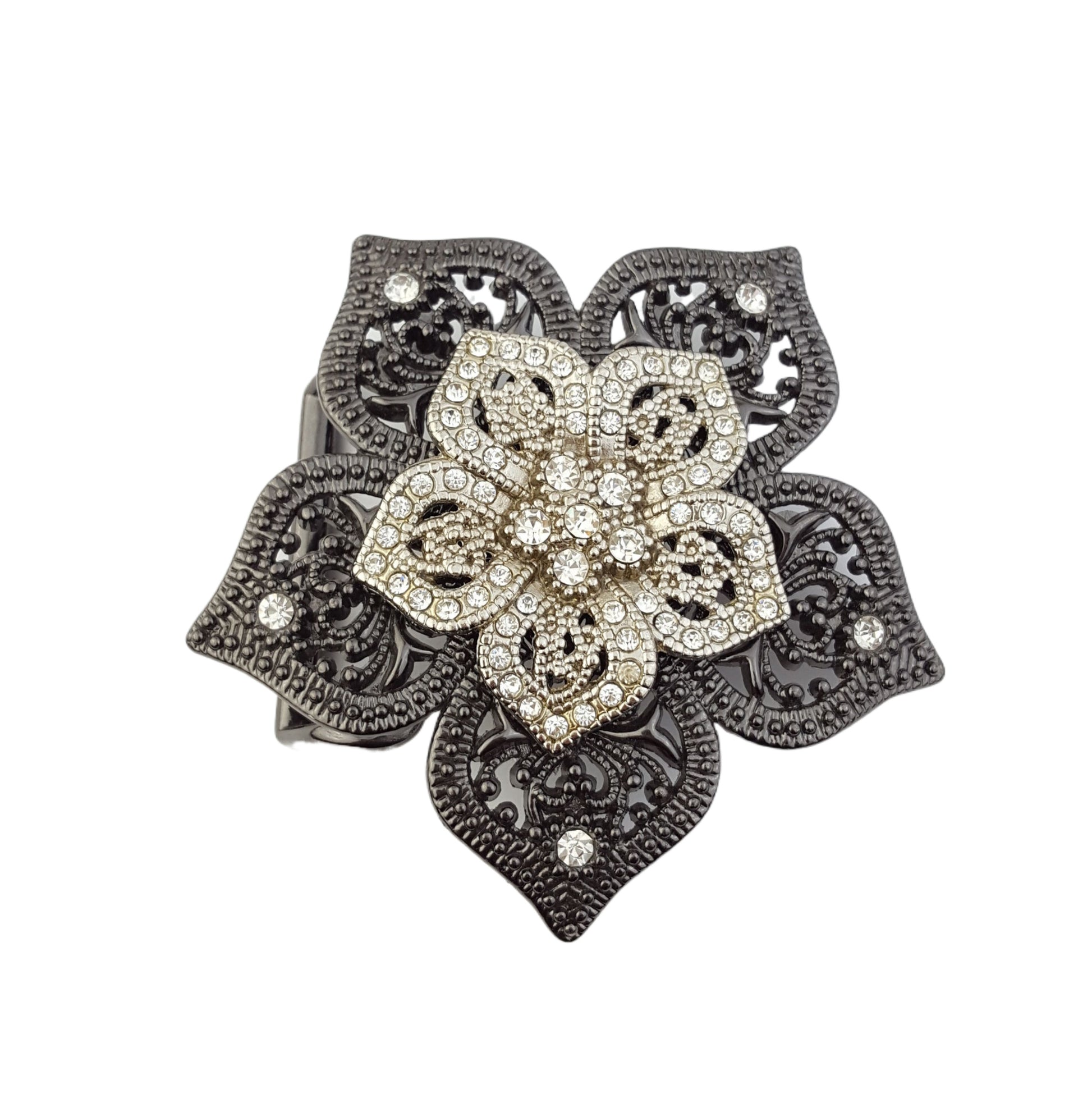 Buckle is made with a small silver buckle overlap on top of a bigger hematite finish flower buckle Decorated with real crystals