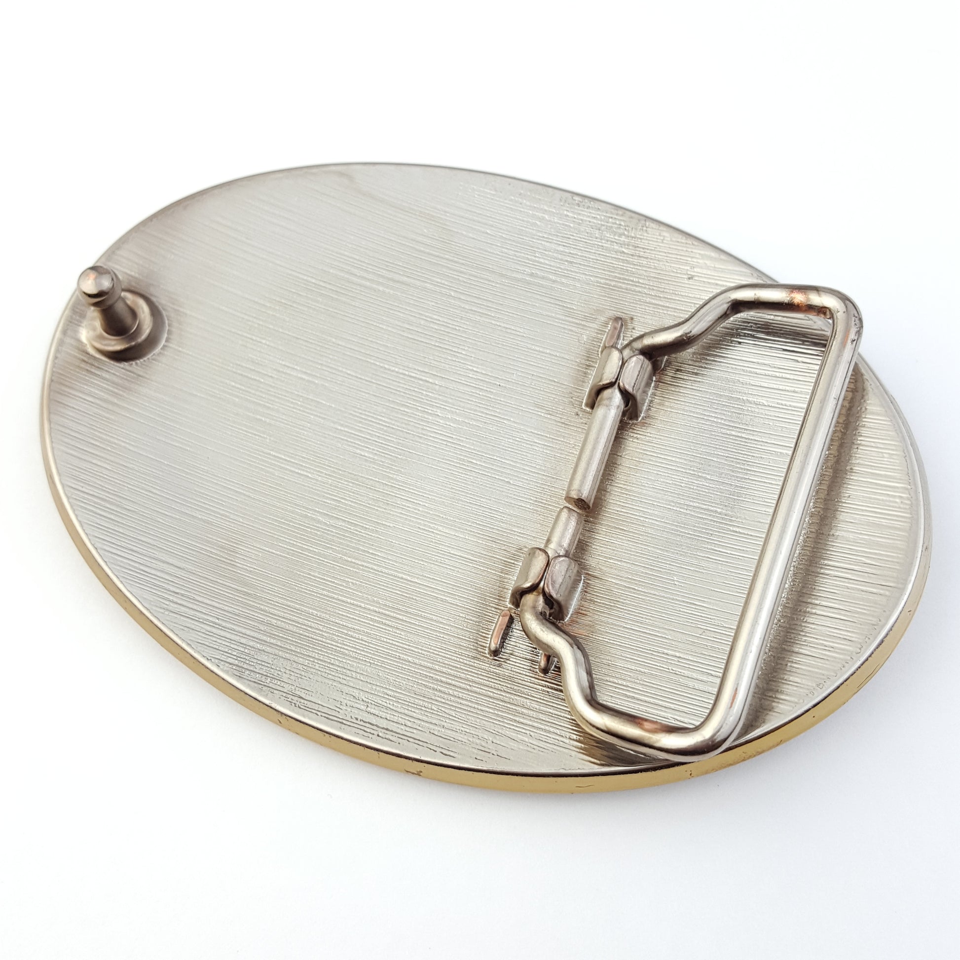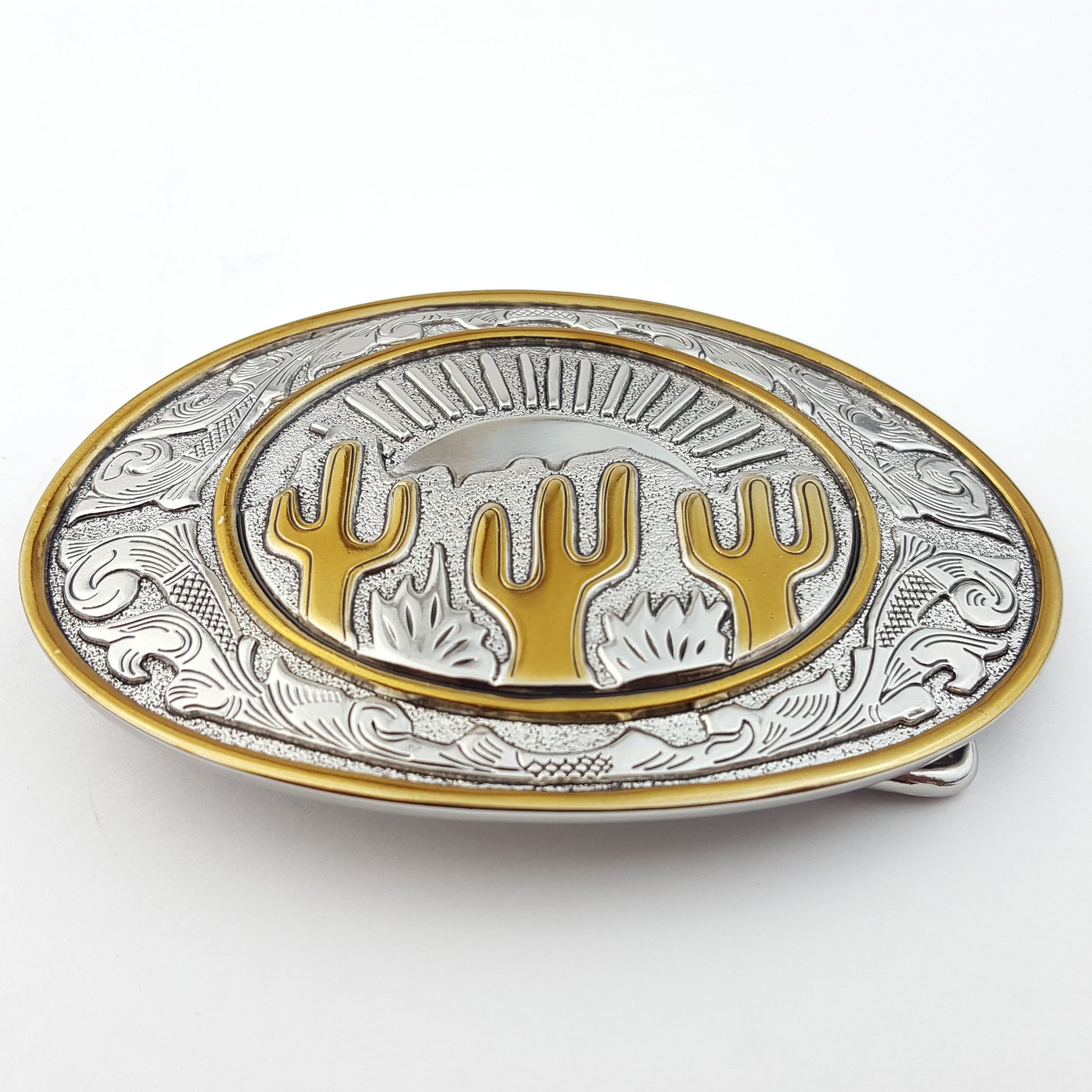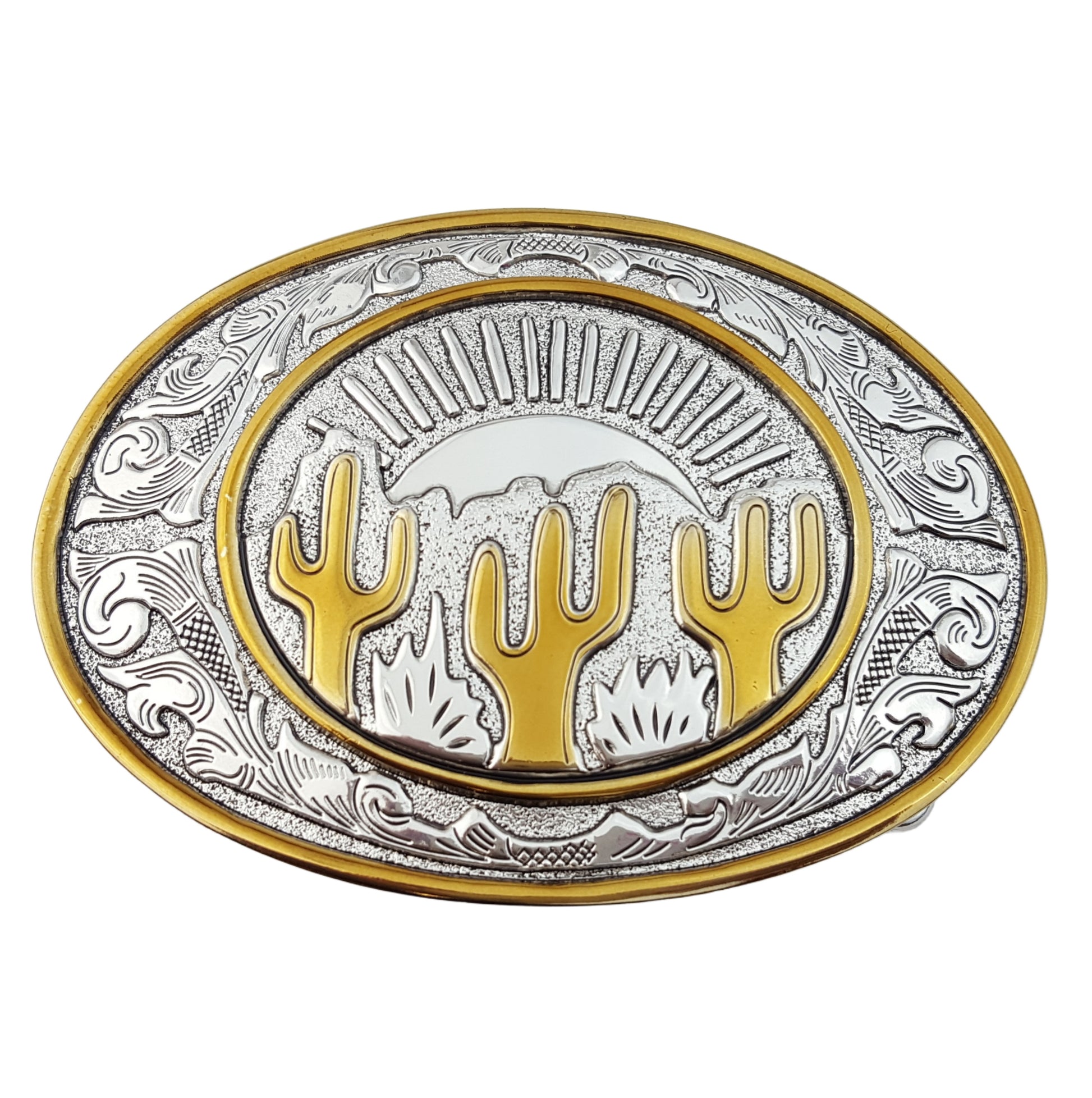 Western-Inspired buckle in Oval shape in Shiny Silver with Gold Trims Desert theme detail with Cactuses and Rising Sun.