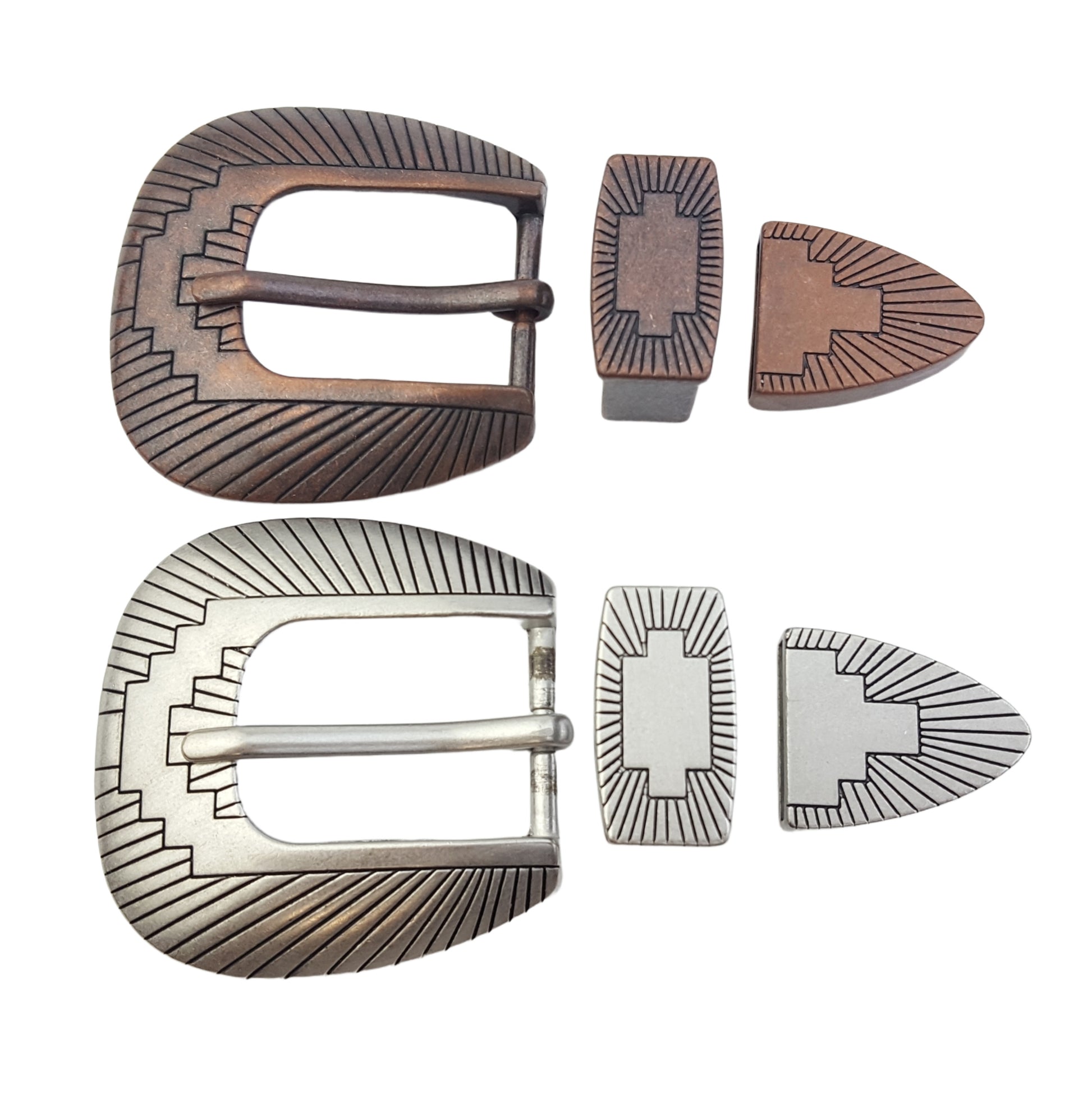 Navajo, Western-Inspired with geo lines etched on the matching buckle, loop and tip set Outer Dimension of the set Buckle: 2.25" x 2.2" Loop : 1.2" x 0.45" Tip: 1.15" x 0.95" Can only fit strap width up to 1"