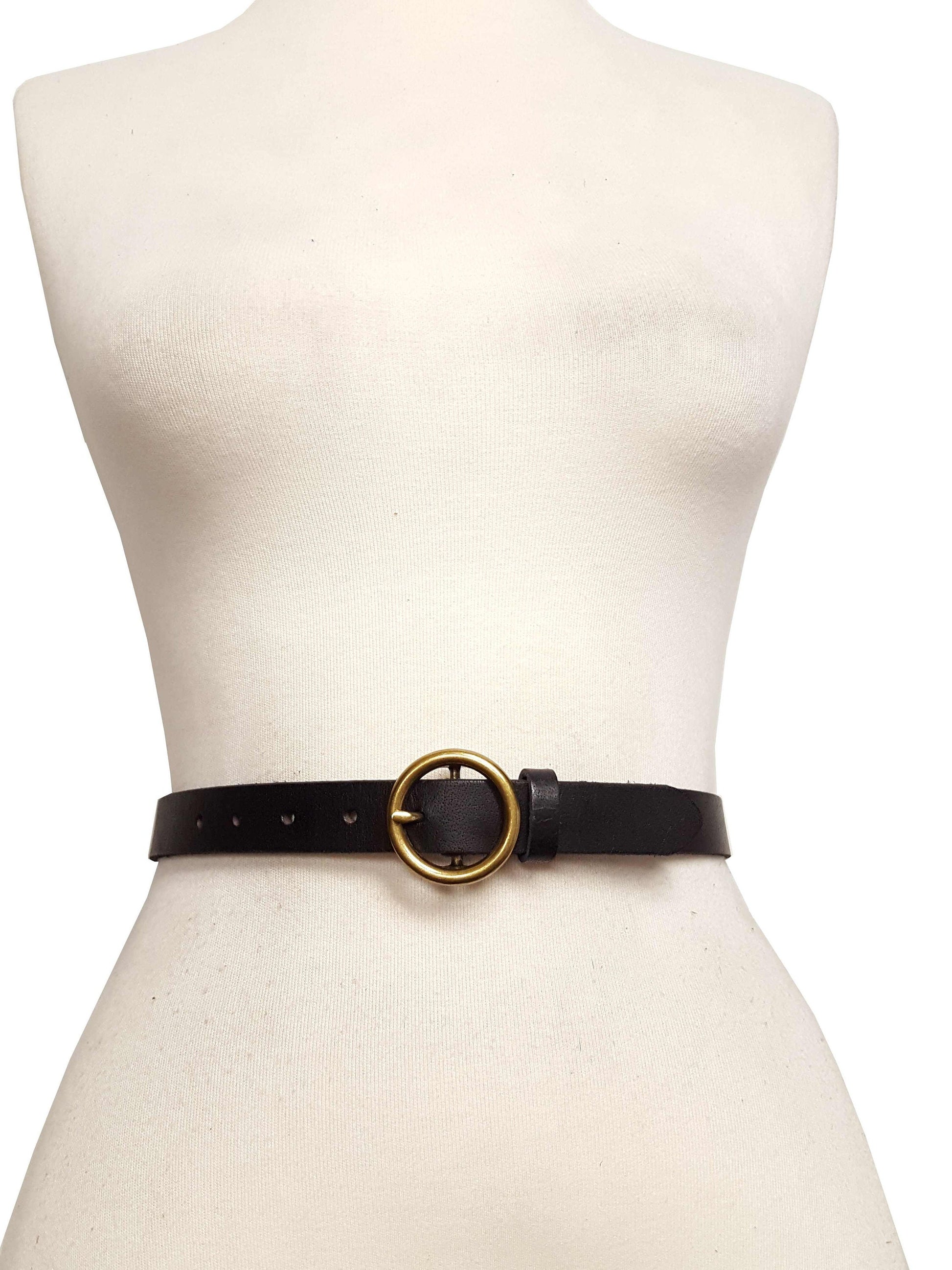 Belt: Genuine Leather Skinny Belt with Round Brass Buckle