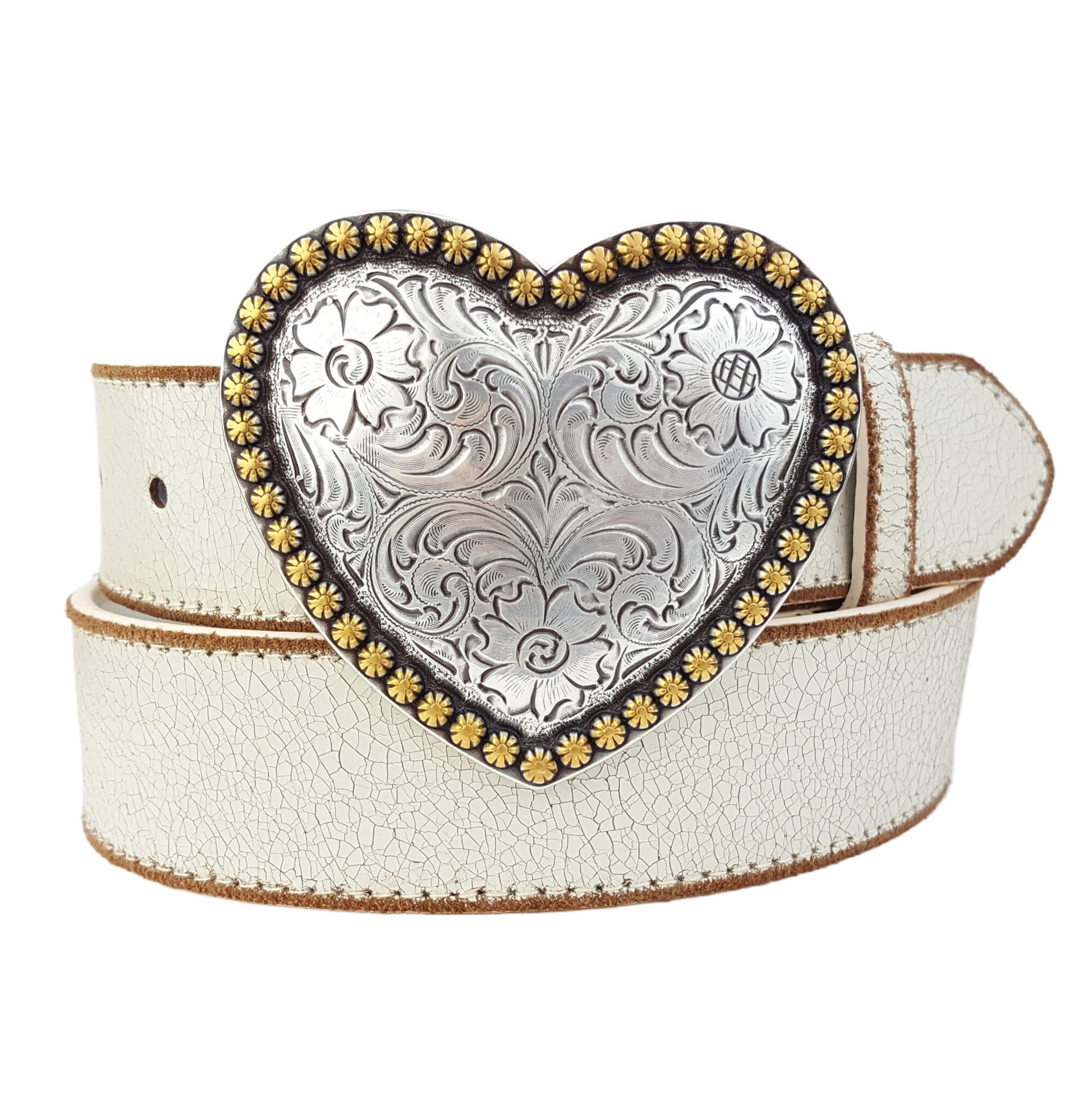 Quality Vintage Distressed belt with a round antique silver buckle Quality Heart Buckle with floral etched and small flower in gold around the buckle Dimension of buckle is 3.5" x 3.15" Belt Strap in vintage leather and edge is sand-off to show the distress look! Width is 1.5" or 38 mm , Fits perfect for jeans Strap Measurement end to end, not including buckle S: 36", M: 40", L: 44", XL:48" Strap measurement to middle hole(S/30", M/34", L/38", XL/42") Please refer to size chart Straps has snaps if you like to remove buckle